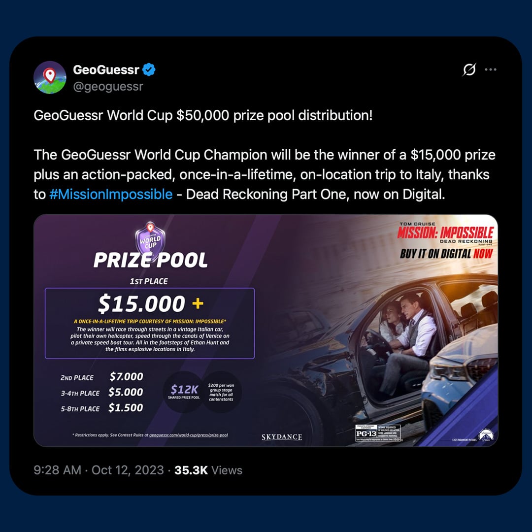 Timed perfectly with our release window, we partnered with Trevor as he hosted the world’s 1st-ever GeoGuessr World Cup, a high-stakes geography-guessing competition. Livestreamed on-set from Sweden, the world’s top geography players competed for a Mission-inspired vacation as millions online watched the inaugural event.